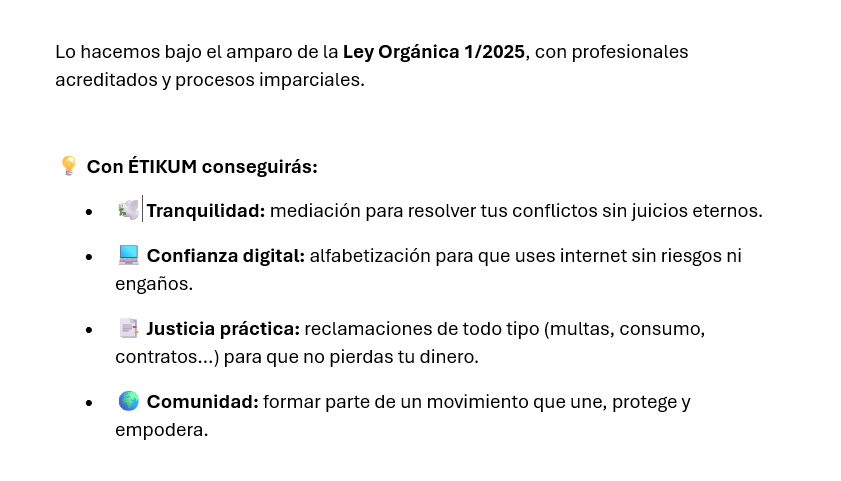 ÉTIKUM nace para dar la vuelta a esa realidad. No por azar, sino fruto de la observación constante de la sociedad y bajo el amparo de la Ley Orgánica 1/2025, que impulsa los Medios Adecuados de Solución de Controversias (MASC).